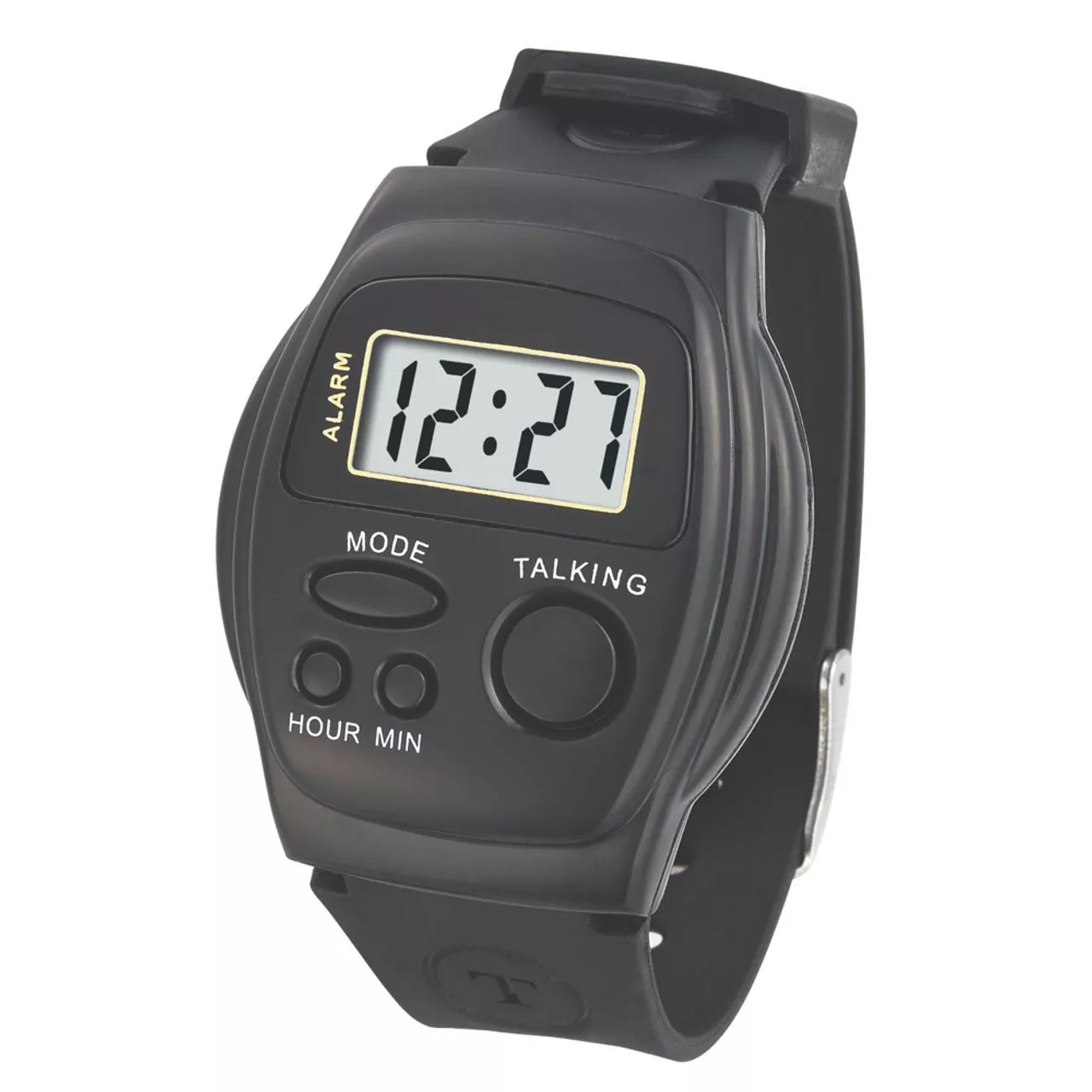 Economical talking digital watch has the “talk” button on the front face of the watch, giving the user easy access to hearing the time. The button is easy to find and easy to press, so the user doesn’t have to struggle to hear the watch speak. All setting buttons are also on the front.